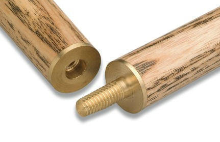 This 57” two piece cue is manufactured from sports grade Ash offer superb value for money. The cue features a simulated machine spliced Ebony butt decorated with a front splice of genuine Zebrawood with a Blue veneer. The brass 'Cannon' joint is fitted in the center of the cue. The butt is finished with a brass Cannon disc and a protective leather butt pad. For 'push on extensions' to fit this cue please view the 'related products' section of this page. This cue features a solid brass ferrule and 9.5 to 10mm nominal Blue Chrome Leather tip.